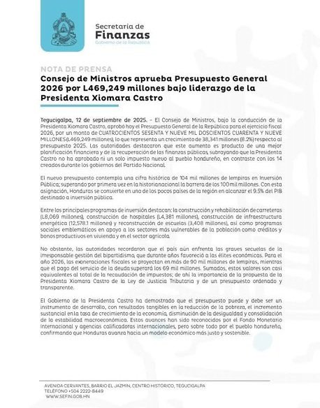 Tegucigalpa, Honduras, DiarioHouse.Com – El Consejo de Ministros de Honduras aprobó hoy el Presupuesto General de la República 2026, con un monto total de 469,249 millones de lempiras, reflejando un incremento del 8.2% respecto al presupuesto del 2025. Esta asignación consolida un enfoque estratégico en la inversión pública, posicionando al sector energético como motor fundamental del desarrollo económico, social y sostenible del país.