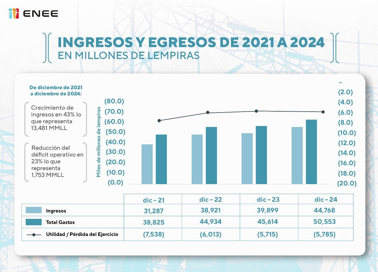 Entre 2010 y 2022, las pérdidas técnicas y no técnicas en el área de Distribución crecieron 16.34%, generando un impacto de 89 mil millones de lempiras en las finanzas de la institución. Durante ese periodo, se contrató a la Empresa Energía Honduras (EEH) con la promesa de modernizar la red y reducir pérdidas, pero tras recibir pagos por más de 23 mil millones de lempiras, las pérdidas, lejos de disminuir, aumentaron en casi 6%.