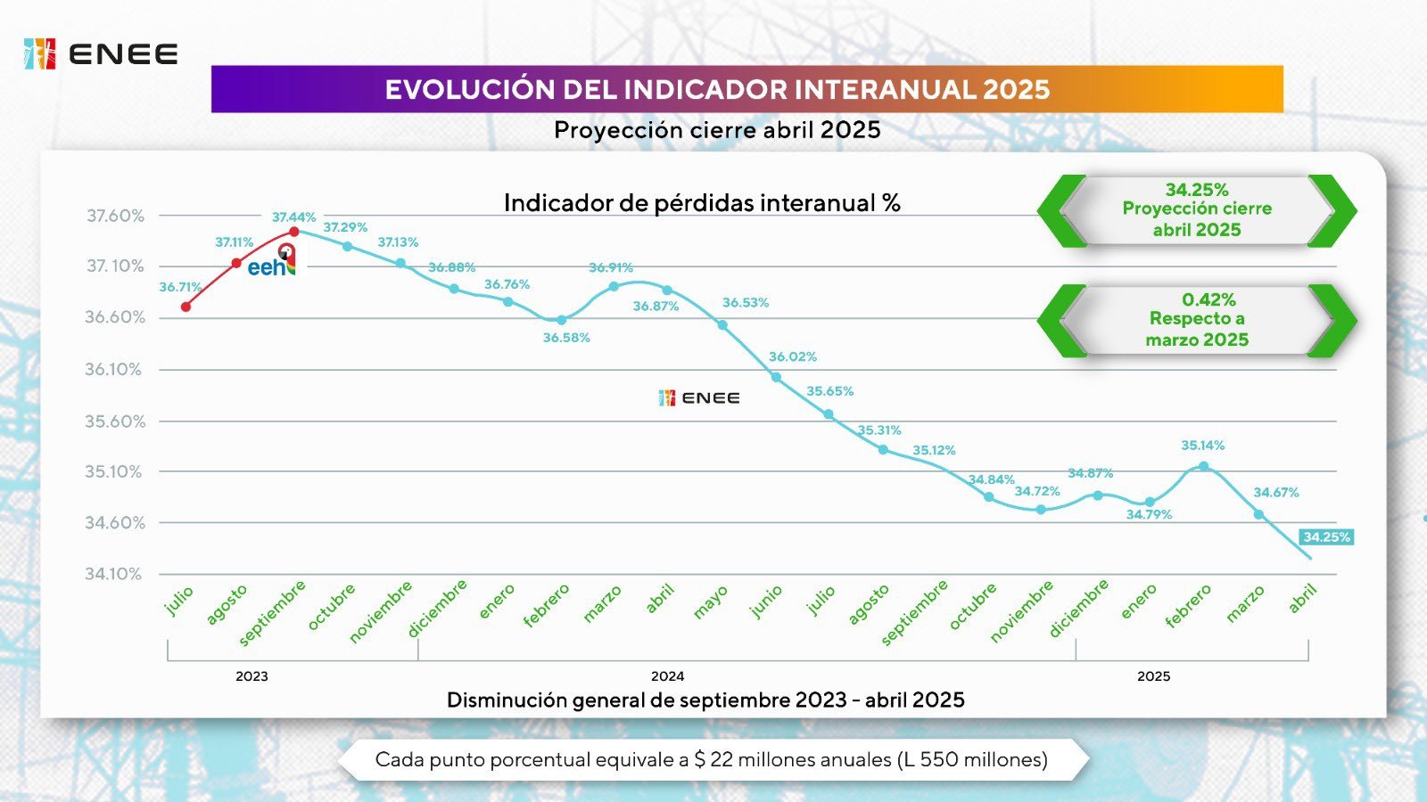Ese escenario cambió drásticamente en agosto de 2023, cuando la ENEE asumió completamente el control de la Distribución. Desde entonces, los resultados son tangibles: la estatal ha reducido las pérdidas en un 3.2%, y para finales de 2025 se proyecta una reducción acumulada cercana al 4%, lo que representa la mayor mejora en 16 años.